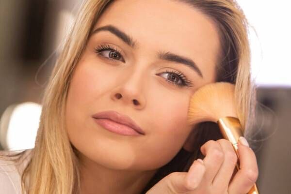 顔の外側(耳やあごのライン)は、ついているかついていないかくらいで仕上げ、最後にフェイスパウダーを叩きます。