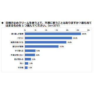 紫外線対策として「日焼け止めクリームを塗る」と回答した人は84.3%だった。日焼け止めクリームを使ううえで不満に思うことについて聞くと、「塗り直しが面倒」(26.5%)、「ベタつく」(22.3%)、「結局日焼けする」(19.6%)が上位を占めた。「特に不満はない」はわずか4.8%で、およそ95%は何らかの不満を感じていることがわかった。