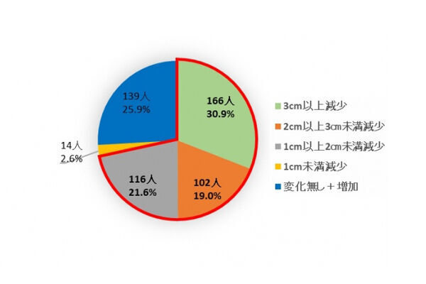 プログラム期間中、腹囲がどのくらい減少したか尋ねたところ、「3cm以上」が30.9%、「1cm以上2cm未満」が21.6%、「2cm以上3cm未満」が19.0%で、合わせて7割が1cm以上腹囲が減少したと回答した。期間中の1cm以上の減少成功者を集計したところ、平均して約2cmであったという。