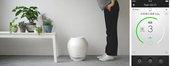 『加湿器 Rain Wi-Fiモデル』は、スマホアプリを使うと外出先から電源のオンオフや、部屋の湿度の確認、設定湿度の変更操作などが可能。外出時は控えめに設定しておいて、帰宅直前に部屋をしっかりと加湿しておけるのは、ムダがなくて嬉しいですね。