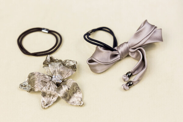 (写真左)ロゴポニー¥1,900、フラワークリップ¥10,000 ※森下さん使用アイテム、(写真右)リボンつきポニー¥7,000 すべて税抜 /コレットマルーフ 新丸ビル店