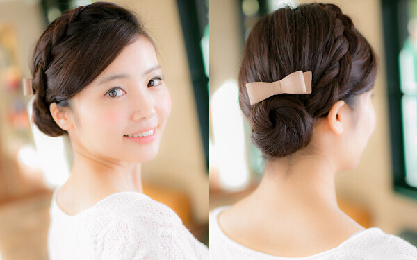 片側サイドに大きめの編込みをバックまで編み、反対側はお団子をふんわりまとめたスタイル。編込みは太くくずして、ラフにするのが◎