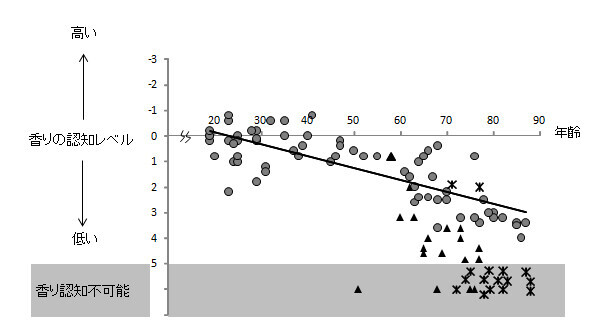 図1 健常者とアルツハイマー病、パーキンソン病における香りの認知レベル(縦軸)と年齢(横軸)との関係を示したもの。 ●健常者 ▲パーキンソン病 ✳アルツハイマー病 縦軸下方は認知レベルが低いことを示し、レベル5より下方は認知不可であることを示す。健常者(●)でも年齢とともに香りの認知レベルは減少していく。パーキンソン病(▲)では健常者の同年齢で比較すると認知レベルが低く、アルツハイマー病(✳)ではほとんどの患者が香りを認知することができない。 Masaoka et al., Markers of brain illness may be hidden in your olfactory ability: A Japanese Perspective. Neurosci Lett. 2013, 549:182-5 より改編。