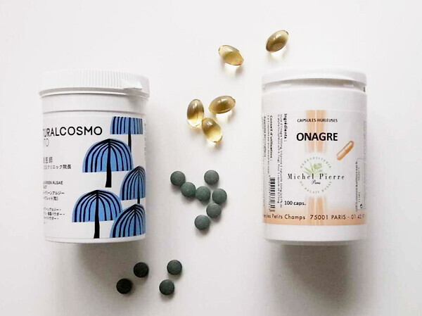 左:ナチュラルコスモ フィト AFAブルーグリーンアルジー イージータブレット 180粒 ¥5,000 右:イブニングプリムローズ(月見草) オイルカプセルはパリのエルボリストリー(ハーブ専門薬)のもの
