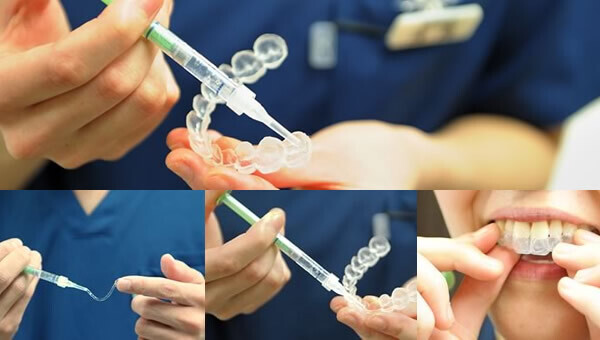ご自宅では、そのマウストレーに、ホワイトニングのジェルを塗布してマウストレーを歯にはめていただきます。