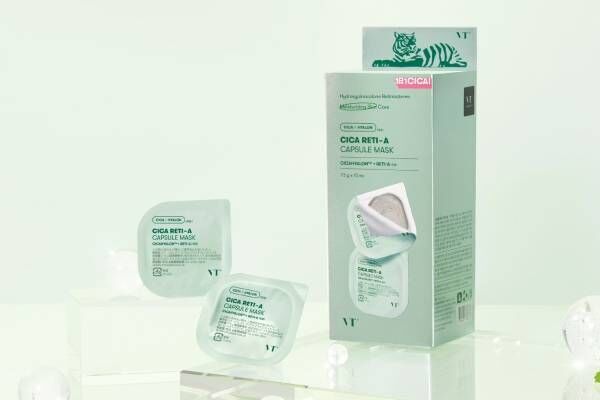 「シカレチA カプセルマスク」は、安定性の高いレチノール誘導体(※3)とVT CICA、炭パウダー(※4)を含む、もっちりと粘性のあるテクスチャーが肌にピタッと密着し、皮脂・老廃物(※5)をしっかりと落とす。植物由来の細かいスクラブ粒子(※6)が気になる角質をケアし、なめらかな肌質へと洗い上げる。