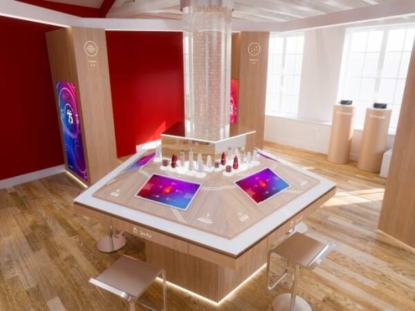 また2階フロアでは、タッチ スクリーンを駆使した「スマート ビューティー ウォール」を用意。自動的に来場者一人ひとりの肌分析結果とスキンケア アドバイスが表示され、さらに中央に設けられた「スマート ビューティー カウンター」を通ると分析結果に沿っておすすめの製品も紹介してくれる。もちろん、画面に表示された情報をもとに、好きなだけアイテムのタッチ&トライも可能だ。