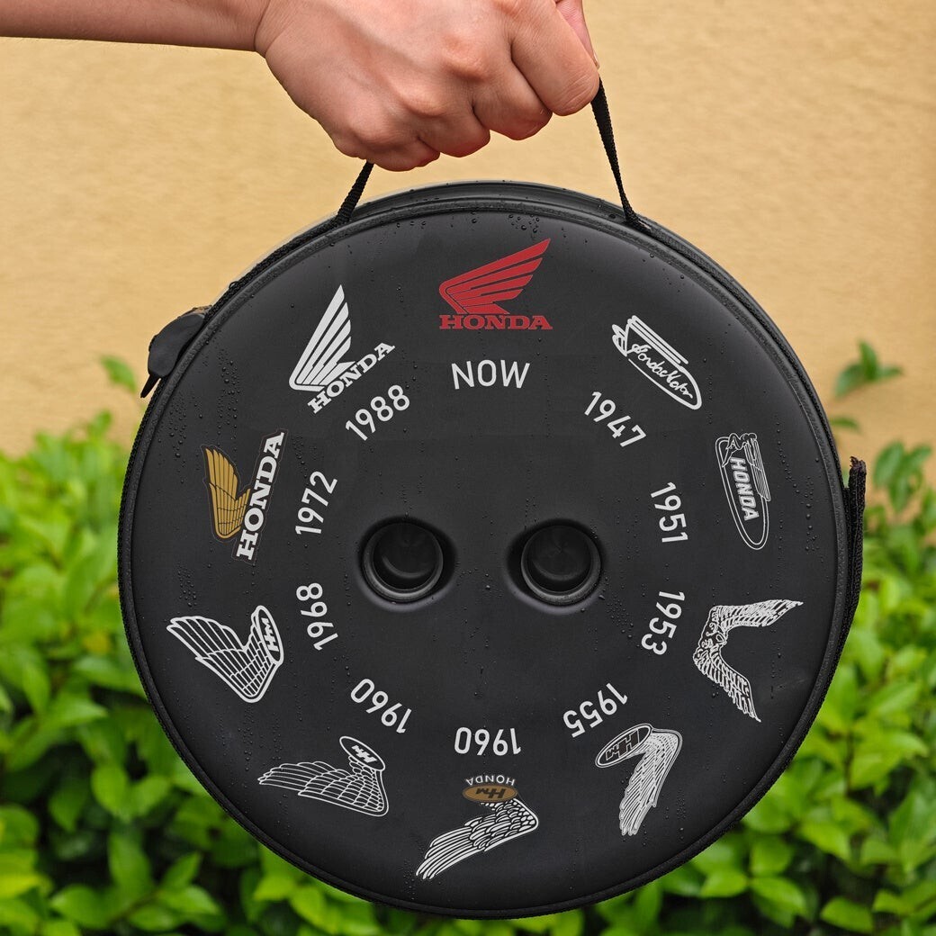 1953年から現在に至るまで、Hondaの歴代ウィングロゴの変遷を一面にあしらった折り畳みスツールは本田技研工業の正式ライセンスを取得した公認アイテム。