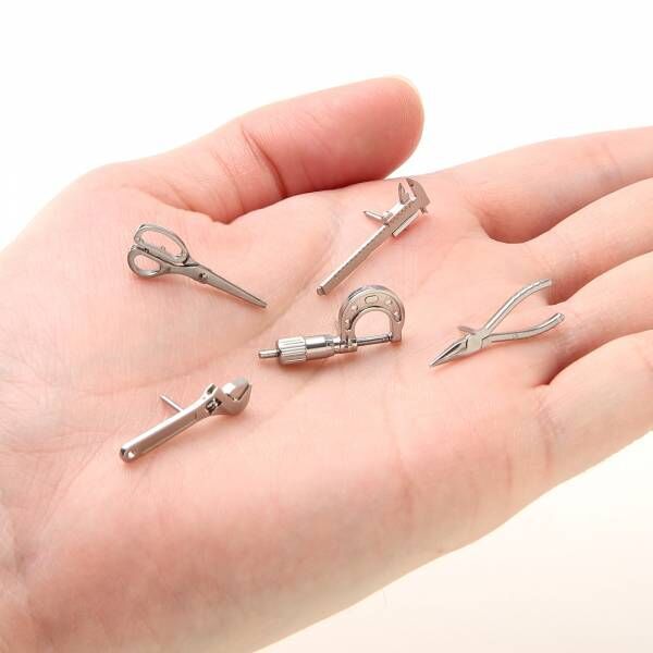 ミニチュアサイズのハサミ、ノギス、マイクロメーター、ラジオペンチ、モンキーレンチの5種類を用意。