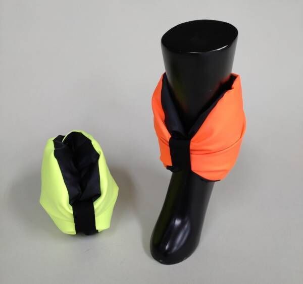 足首を温めながらも可動性を損なわず、ケガのリスクを減らすことが期待できるリボンウォーマー。これに蛍光色の生地を用いることで、野外活動の危険を減らすこともできるのではという思いから、この度「リボンウォーマーSPORTS」を開発いたしました。