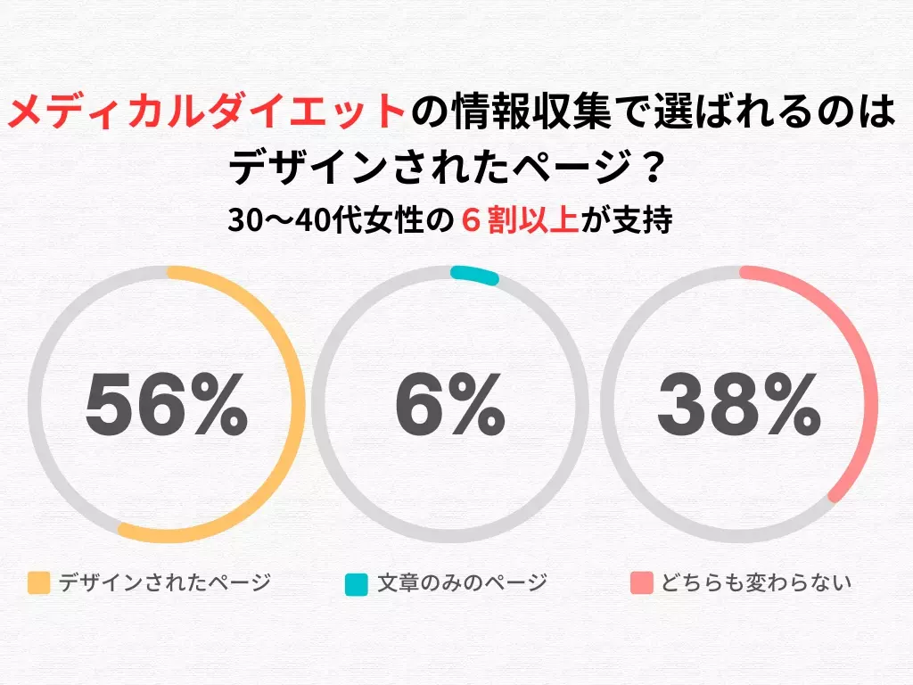 今回のアンケートは、全国の20歳〜49歳の女性を対象に、インターネット上で実施されました。設問は、「メディカルダイエットの情報を収集する際、デザインされたページと文章のみのページのどちらを利用したいか」というもの。その結果、「デザインされたページを利用したい」と答えた割合が過半数を超え、視覚的に整理された情報がユーザーに安心感や理解のしやすさを与えることが分かりました。特に、視覚に訴えるレイアウトやイラスト、図解のあるページは、ダイエットのプロセスやメリットをより伝えやすくする要素となっています。