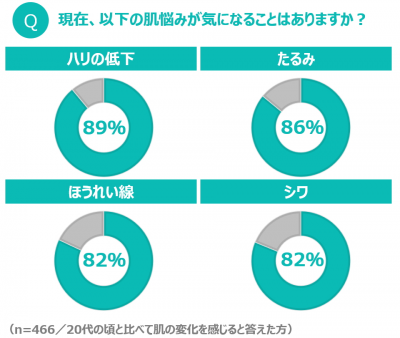 「たるみ」(86%)、「ほうれい線」(82%)、「シワ」(82%)が気になっている人もそれぞれ8割台にのぼりました。