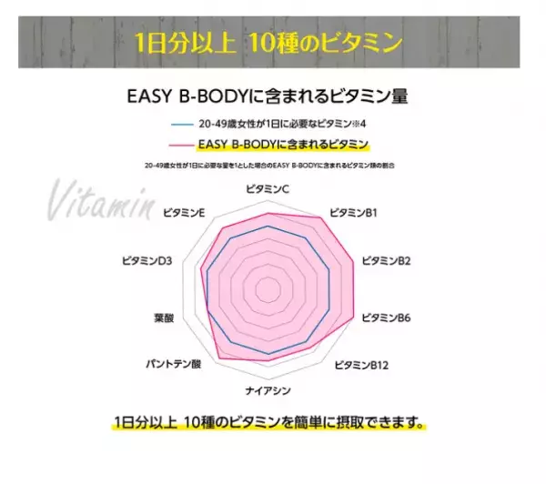 不足しがちな栄養をしっかり補給「EASY B-BODY」は、20歳から49歳の女性に必要な10種のビタミン(1日分以上の量)を配合。1食置き換えるだけで、美容・健康のどちらにも欠かせないビタミンを簡単に補給することが可能となっています。