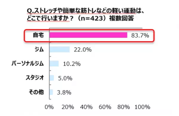 運動をする場所は「自宅」(83.7パーセント)が最多。次いで「ジム(22パーセント)」「パーソナルジム(10.2パーセント)」という結果となりました。