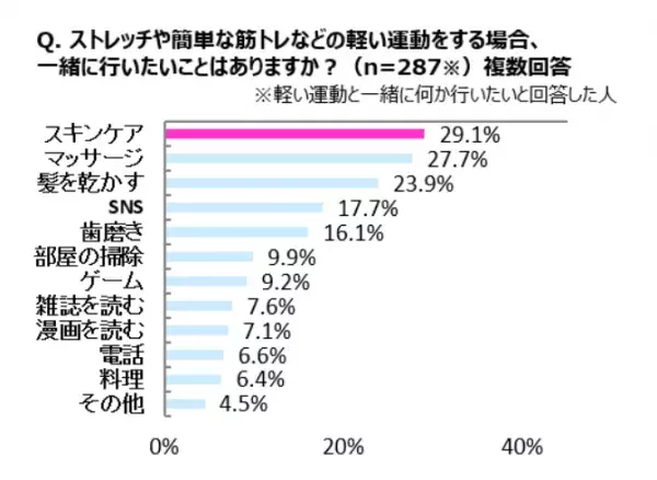 運動しながら効率よくスキンケア運動をしながらやりたいことについての質問に対しては「スキンケア」が29.1パーセントでトップ。
