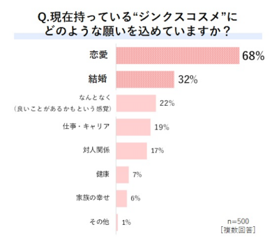 ジンクスコスメを持っている女性が込める願いは「恋愛」「結婚」が多いパラドゥ株式会社では、普段使用しているメイクアイテムの中で、お守り代わりに使ったり、ゲンを担いだりといった、「これを使うと良いことがありそう」という気持ちで使うアイテムを“ジンクスコスメ”として定義。