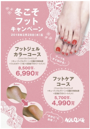 キャンペーン期間中は「フットケアコース」が通常5700円から4990円に、「フットジェルカラーコース」が通常8500円から6990円になり、おトクに利用可能です。