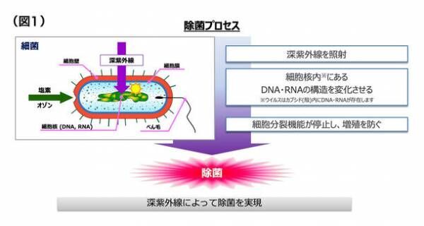 UVC除菌ライトは、スタンレー電気株式会社が製造する深紫外(UVC) LEDを採用した除菌装置です。除菌の原理は、エアコンフィルターに捕集した微生物(ウイルス、細菌、バクテリアなど)にUVC除菌ライトを照射することでDNA・RNAのらせん構造を変化させ、増殖機能を阻害させることで除菌が行われます。(図1)
