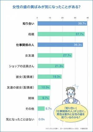 周りにいる女性で歯の黄ばみが気になったことがあるかを聞いたところ、一番多かったのは「知り合い」で、全体の39.7%を占めています。2位は「母親」(37.7%)で、3位は「仕事関係の人」(36.3%)と続いていますが、身近にいる家族やパートナー以上に、「知り合い」の歯の黄ばみが気になる人が多いというのは少し意外な結果かもしれません。とはいえ、1~3位まではいずれも3割台の僅差となっています。
