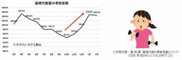 冬は痩せないというイメージを持っている方も多いかもしれませんが、実は1年で1番代謝が上がる時期で、ダイエットに適した季節だともいわれています。人間は恒温動物であるため、体温を36度程度に保ちます。1年中体温をを36度程度に保つために基礎代謝としてエネルギーが使われます。夏は少ないエネルギー消費量で体温をキープできるので基礎代謝は低めですが、気温が低い冬は、体温を上げるためにより多くのエネルギーを消費し、熱を生み出そうとして、基礎代謝量が急増します。この季節にしっかり運動を行うと効率的なのです。