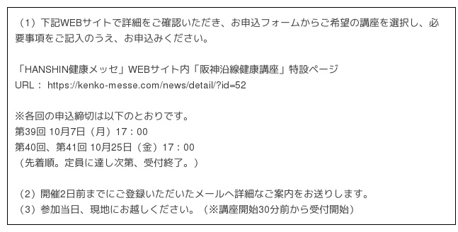 詳細は、「HANSHIN健康メッセ」WEBサイト内「阪神沿線健康講座」特設ページや、阪神電車各駅に設置しているチラシをご参照ください。