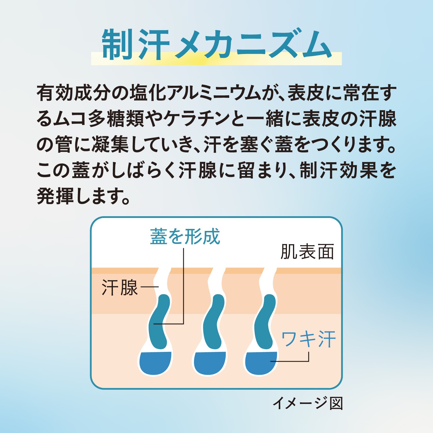 そこで着目したのが、有効成分・塩化アルミニウムによる制汗効果です。入浴後から就寝前の清潔な肌に塗ることで、汗腺に蓋を形成し、汗やニオイを元から塞ぎます。汗をかく前に働きかけるこの制汗メカニズムにより、汗に悩む方々に新たな選択肢を提供し、QOL向上を目指します。