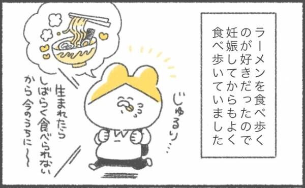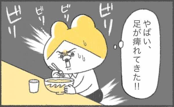 2018年7月生まれの女の子の母、キヨさんのゆるっと笑える育児マンガ! 第16話、キヨさんが趣味のラーメン食べ歩きをしていたところ、足の痺れに襲われて!?