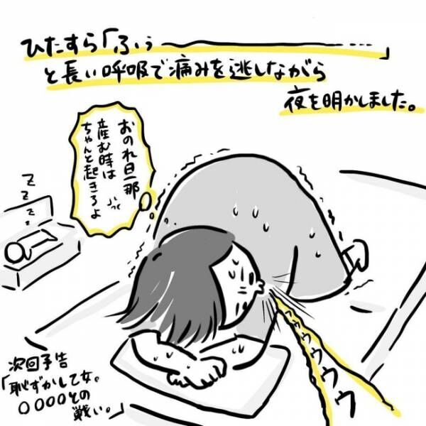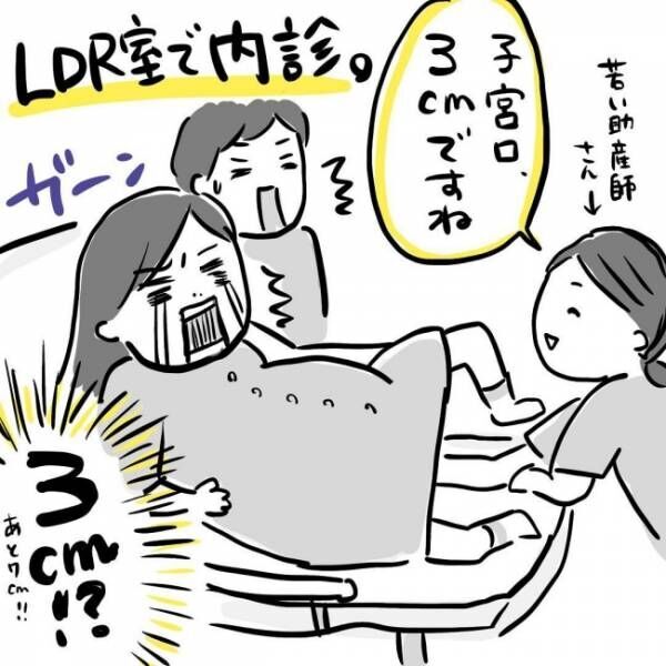 Instagramで人気のあいさん(@yui_dondon)の出産エピソード第1話。陣痛が始まり、産院に到着しました。でも子宮口はまだ3センチ……! 院内で陣痛に耐えている間、あいさんを精神的に苦しめたものとは?