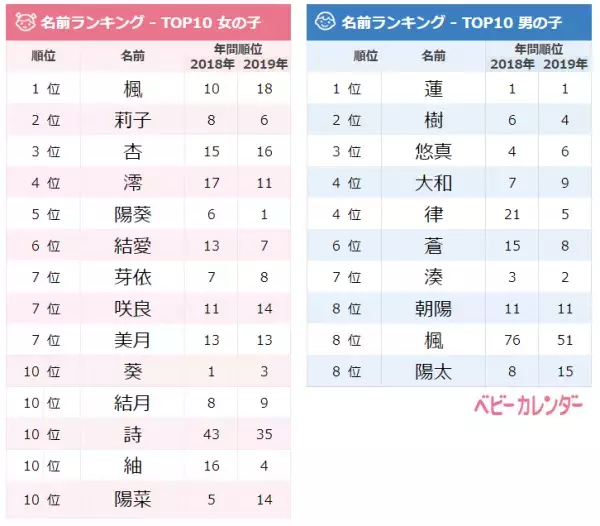 11月生まれの女の子の名前1位は「楓(主なよみ:かえで)」、2位「莉子(主なよみ:りこ)」、3位「杏(主なよみ:あん)」でした。先日発表した2019年生まれの赤ちゃんの名前ランキング(以下、年間ランキング)では「楓」は18位でしたが、10月に引き続き2カ月連続で人気の名前1位を獲得し、特に秋生まれのお子さんに人気が高いことがわかりました。