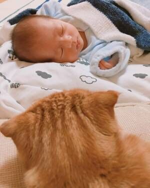 生まれたばかりの赤ちゃんと菊丸、初対面! まだ赤ちゃんが何者なのか分からない菊丸は、少し距離をとって様子を伺っています。
