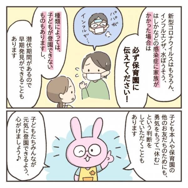新型コロナウイルスはもちろん、インフルエンザ、水ぼうそう、はしかなどの感染症に家族がかかった場合は必ず保育園に伝えてください。感染症の種類によっては、子どもも登園ができないものもあります。感染症にはそれぞれ潜伏期間がありますので、伝えてもらえると、早期発見ができることもあります。