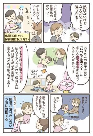例えば、朝起きてお子さんの様子を見て「熱はないけど、いつもと少し様子が違うかも」と感じる親の直感は正解であることが多いです。もし、お仕事を休めるなら保育園も休んで自宅でゆっくりするほうがいい場合もあります。でも、なかなか仕事を休めない場合もありますよね。そんなときは必ず「いつもと様子が違う」ということを保育士に伝えてください。