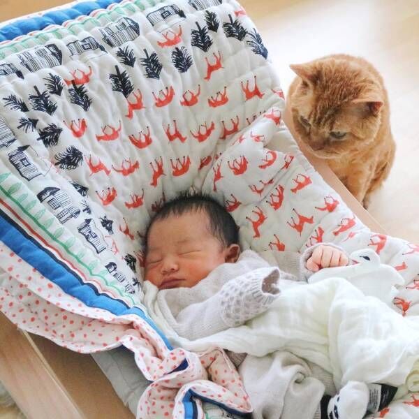 スヤスヤお昼寝中の凪くんを見守る2匹♪