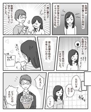 生理中は体が重くなるのと同時に、気分が落ち込んだり、イライラしがちな私。一緒に暮らすパートナーにもつい些細なことで当たってしまうこともしばしば。でも、それが生理のせいだったとは自分で気がついていなかったんです。でも、パートナーのおかげで、イライラの原因が生理だったことに気づきました。そして、彼は驚くような行動に出てくれたのです。