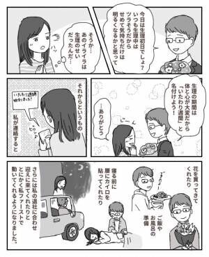 生理が来るたびに気分が重くなり、「女子なんかやめたい!」と思ったことすらあった私ですが、彼の行動をきっかけに、生理中も気持ちだけは前向きになれるように。そして、男性にはわからない女性特有の痛みやつらさを一生懸命サポートしようとしてくれる彼の姿を見て、「この人ととならうまくやっていけそう」と思えた出来事でした。