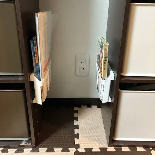 カラボ横収納はフックだけでなくマガジンラックもあるんです! @yurukatanotamaさんは、「カラーボックス用マガジンラック」を使って、図書館や学校、保育園で借りてきた本を入れる場所にしているそうです。つい机に出しっぱなしにしやすいプリント類や郵便物を入れたりしても良いですね。