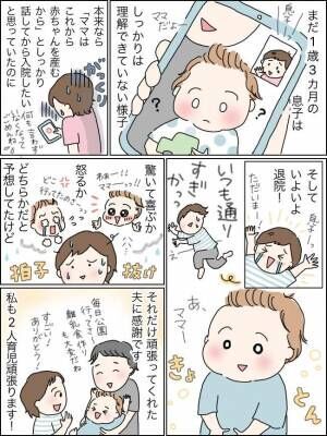 入院生活が終わり、いよいよ退院! やっと息子と会える! そう思い自宅に戻り息子に「いきなりいなくなってごめんね! ただいまー!!」と抱きしめても、きょとんとする息子。