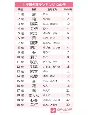 2021年上半期、女の子の名づけTOP20には、春らしさを感じる「陽」を用いた「陽菜」「陽葵」や、「咲良」「さくら」「美桜」などの「サクラネーム」、「春」を用いた「心春」などがランクインしました。特に、あたたかみのある名前の人気が高まったという結果に。これから女の子の名づけをされる方、ぜひ参考になさってくださいね。
