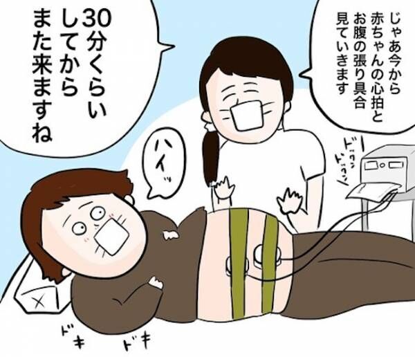 しかし、子宮口は開いていないため、赤ちゃんの心拍とお腹の張り具合を検査することに。