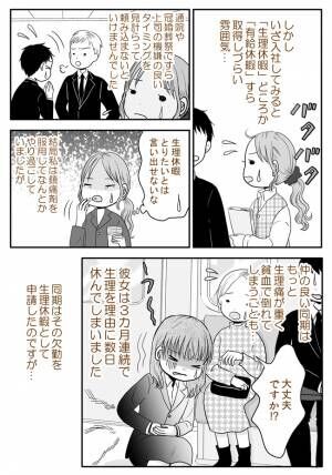 同期は、生理の体調不良で取った欠勤を生理休暇として申請。すると上司と人事を交えて面談することになってしまったのです。面談を終えて戻ってきた同期は半泣きの状態。話を聞くと、案の定「休みすぎ」と指摘されたとのこと。そして「生理で休むのは甘え」「他の女性社員は休んでいない」という内容でお説教されたというのです!