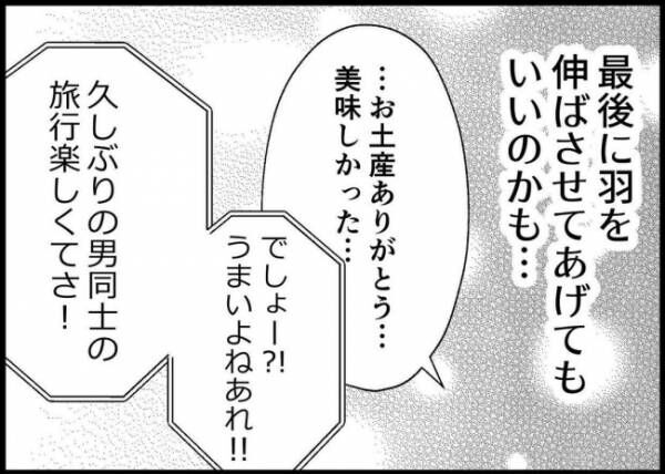 今度は同僚たちと旅行していると、海を背景に、笑顔で自撮りした写真が送られてきた。無神経すぎる夫の行動に、涙をこらえる妻。そこへお土産が送られて来て……。