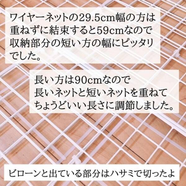 のりちゃんさんは44cmと62cmのワイヤーネットをベビーベッドに合うように並べ、結束バンドで締めています。