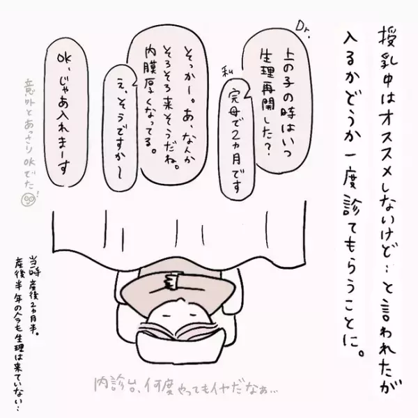 次男・まるくんの授乳中だったアザラシ子さん。お医者さんには「授乳中(ミレーナを入れること)はおすすめしないけど…」と言われましたが、入るかどうか一度診てもらうことに。お医者さんからの質問にいくつか答え、ついに装着の瞬間……!