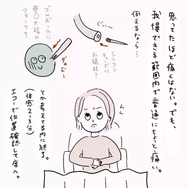 入れてみると、帝王切開などの手術を経験してきたアザラシ子さんにとっては「我慢できるくらいの痛さ」でしたが、シリコンチューブに爪楊枝を押し当てられているような感覚で少し怖かったそう。感覚があるなかでの施術、緊張しますよね……。
