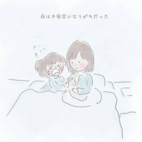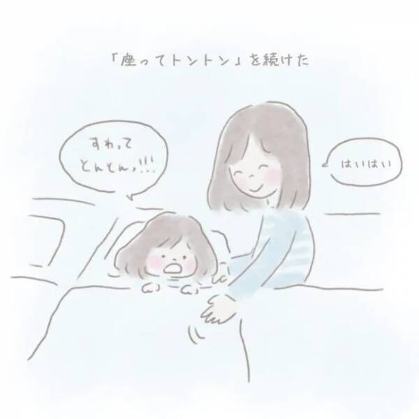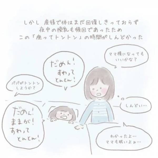 ちりさんは、日中はとんちゃんの授乳や抱っこで、我慢をさせていると思い、寝る前の「座ってトントン」を心がけました。しかし、ちりさんは産後、まだ体が回復しきっていません。夜中の授乳もあり、座ってトントンがしんどくなってきました。