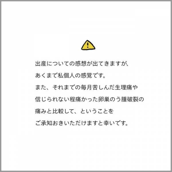 出産を終えて、その痛みやつらさを振り返ったえんさん。出産時の痛みはもちろんありましたが、えんさんの経験の中で、といえば一番痛くてつらかったのは「卵巣のう腫が破裂した」ときが圧倒的だったのだそう。出産の痛みの表現はそれぞれですが、よく「鼻からスイカが出るよう」と表現されるママもいますね。それを上回るほどなのか……と考えると、えんさんの卵巣のう腫破裂の痛みが相当なものだったということがわかります。