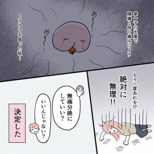 第一子を普通分娩で出産したはちこさんは、あまりの痛さに「もう絶対に産めない! 無理!」と思っていました。ところが2人目を希望し、妊娠。初産で経験した激痛がトラウマになっているため、今回の出産は無痛分娩にすると決めていました。