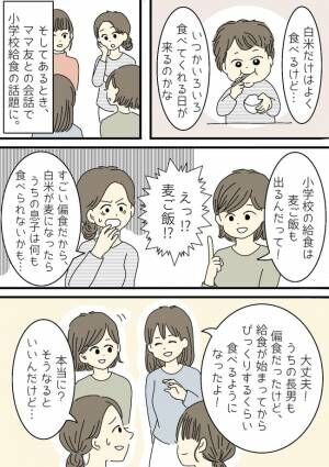 年長になったある日、幼稚園のママ友3人と話をしていると、小学校の給食の話に。「最近の給食って麦ご飯も出るらしいよ。」とAママ。唯一食べられるご飯に麦が入っているなんて!と思っていると、4人の子どもを持つBママが「大丈夫だよ! うちの長男も偏食だったけど、給食になってから食べられるようになったよ!」と励ましてくれたのです。内心本当かな?と思っていました。