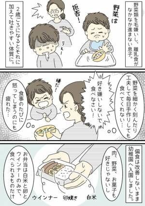 わが家の息子は超偏食。離乳食もなかなか進まず、野菜類をまったく食べてくれません。それに加えて2歳ごろになると吐きやすい体質に。ふりかけに入った小さな海苔がのどに引っかかっただけでえづき、食べたものを全部吐いてしまうほどでした。どうしたら食べられるのかと悩み、細かく刻んだ野菜入りのおやきやお好み焼きなどを手作りましたが、結局食べてくれず。「好き嫌いしないで食べなさい!」と、食事のたびに怒ることにも、ほとほと疲れていました。