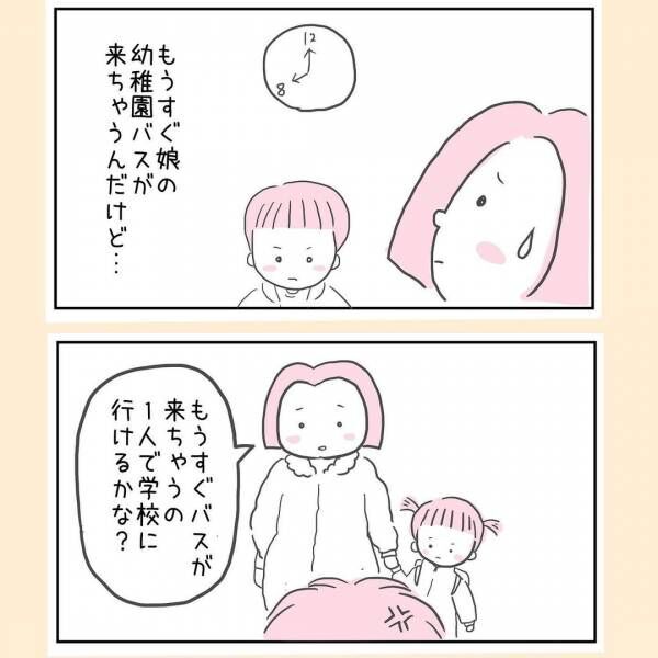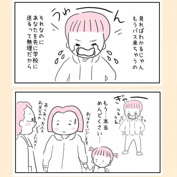 妊娠8カ月に入り、おなかも目立ってきて動くのも大変になってきたあゆみさん。そんなある日、朝から不機嫌モード全開の息子が妹よりも先に学校に送ってほしいと言いました。しかし、あゆみさんは幼稚園のバスが到着するため断ります。